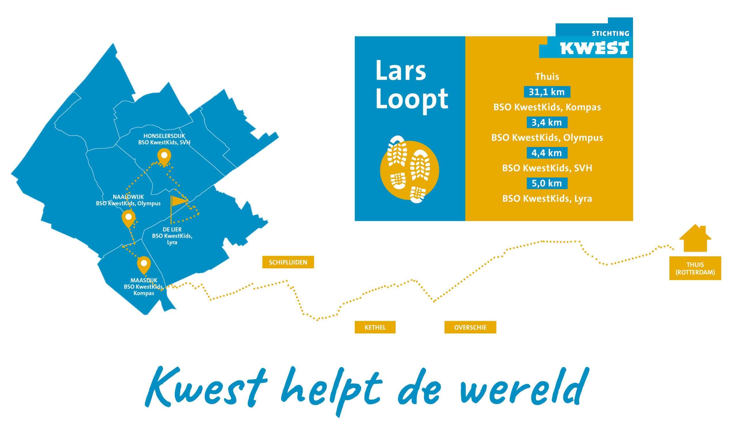 Een bijzonder moment volgt op vrijdag 3 april. Dan loopt onze collega Lars een sponsorloop vanaf zijn huis in Rotterdam langs verschillende BSO-locaties. De totale route is iets langer dan een marathon. Onderweg wordt per dorpskern één locatie bezocht. De voorlopige route loopt langs: