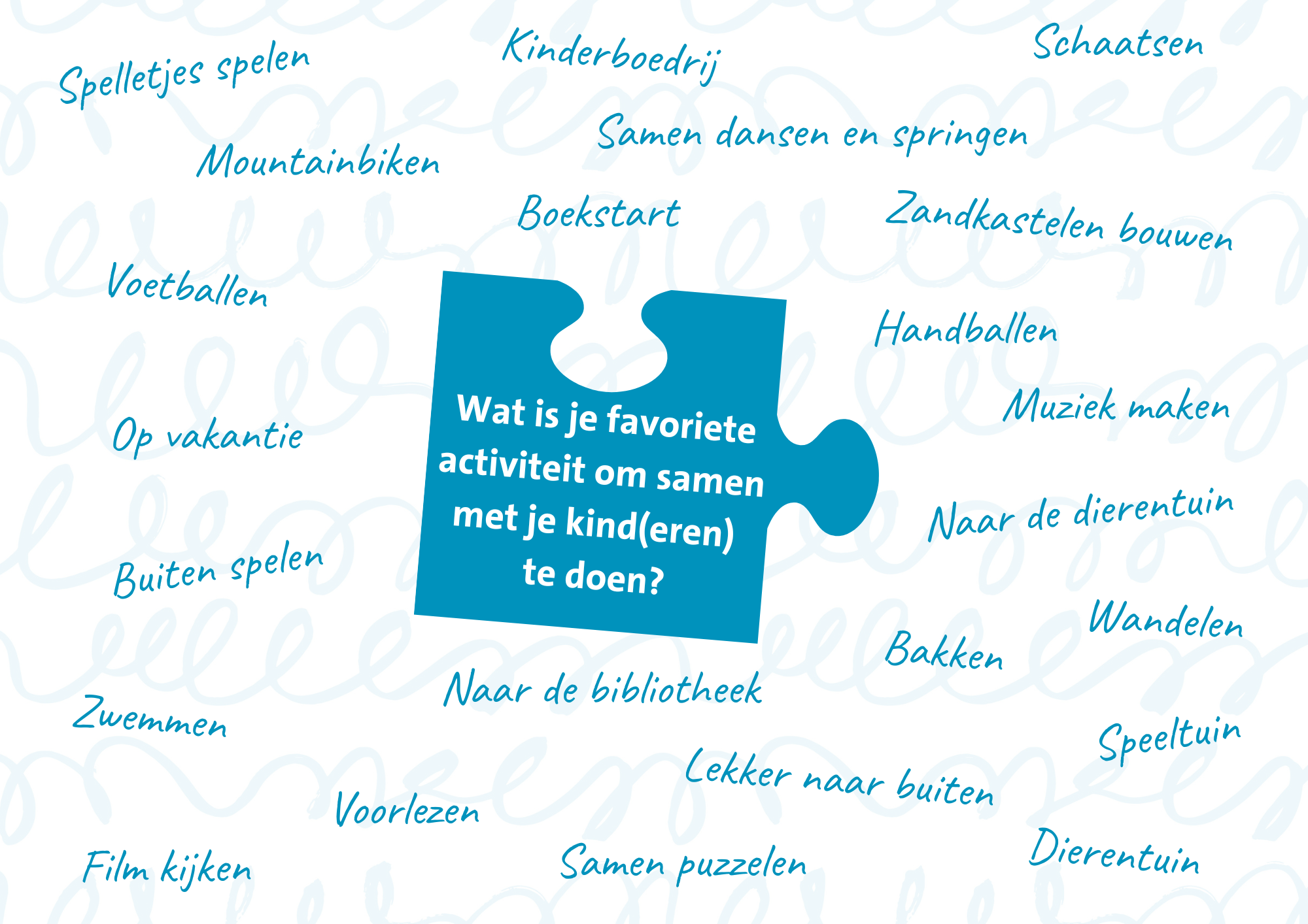 Tijdens de Week van de Opvoeding vroegen we ouders om met ons mee te puzzelen. Op onze locaties hingen grote puzzelstukposters met vragen over opvoeden. Eén van die vragen was: Wat is je favoriete activiteit om samen met je kind(eren) te doen?